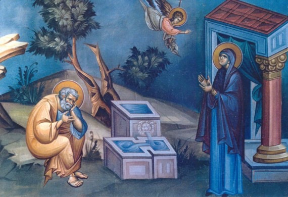 Today the bonds of childlessness are loosed, / for having heard Joachim and Anna, / God clearly assures them of the birth of the Mother of God, / from whom He Himself, the Uncircumscribed One, was born, / becoming man when He commanded the Angel to cry out: / “Hail, full of grace, / the Lord is with you.”