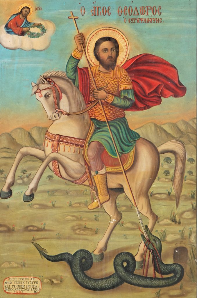 The Great Martyr Theodore Stratelates came from the city of Euchaita in Asia Minor. He was endowed with many talents, and was handsome in appearance. For his charity God enlightened him with the knowledge of Christian truth. The bravery of the saintly soldier was revealed after he, with the help of God, killed a giant serpent living on a precipice in the outskirts of Euchaita. The serpent had devoured many people and animals, terrorizing the countryside. Saint Theodore armed himself with a sword and vanquished it, glorifying the name of Christ among the people.